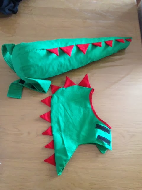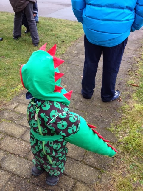 Mathias har endnu ingen holdning til, hvad han vil klædes ud som, så jeg valgte, at han skulle være drage (for han er ret glad for sine sutsko med drager på!). Jeg syede en hue efter mit eget elefanthuemønster, men syede takker imellem de to sider. Halen er syet efter denne DIY.