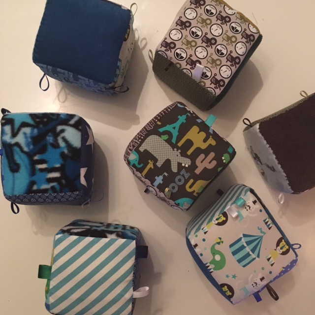 På min sommerferie havde jeg en kasse stofrester med, og der fik jeg klippet en masse firkanter (11×11 cm). 42 af de firkanter er nu suppleret med diverse bånd, og syet sammen til aktivitetsterninger. Fyldet består af 4 lag skummadras, og er således rester fra sengerande og babyneste. I midten af terningen er lagt en lille rasleboks, så den også stimulerer høresansen.