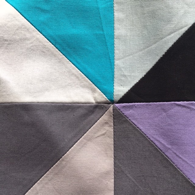 Jeg har skåret firkanterne 40x40cm, og så skåret dem igennem på tværs, så det blev til trekanter. Jeg har brugt hvid, lysgrå, grå, sort, aqua, lavendel og turkis. Der er et enkelt lag pladevat i midten og ensfarvet grå på bagsiden.