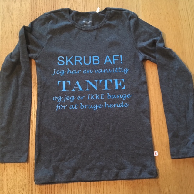 Det er nemt at lave teksten i Silhouette softwaren, og så skal man bare huske at spejlvende teksten inden den skæres ud i strygevinyl. Min lille niece på 2 boede nærmest i blusen de første 2-3 dage, før hendes forældre kunne få den af hende 🙂