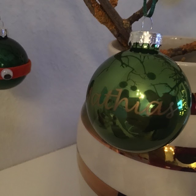 Jeg har længe været lidt misundelig på @diana.haugaard fine julekugler med navn, og nu har jeg fået lavet mine egne med mine to guldklumpers navne. Navnene er skåret på min Silhouette Cameo med skiltefolie fra The Lettershop, og så bruger jeg applikationstape til at få skiltefolien over på julekuglerne.