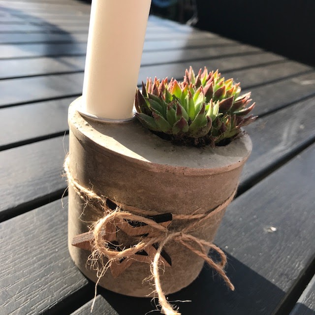 De to spande hobbybeton rækker til flere projekter end dem jeg allerede har vist (her og her). Denne lille urtepotte med lysestage er støbt i en plastikbøtte fra honning, mens hullet er lavet med et lille yogurtbæger. Lysmanchetten er også sponsoreret af CC Hobby.