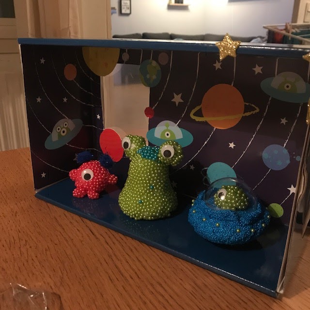 Det er super smart at kassen kan laves om til en ‘kigkasse’, så man kan lave en lille udstilling med de fine planeter og aliens. Det er rigtig godt tænkt.